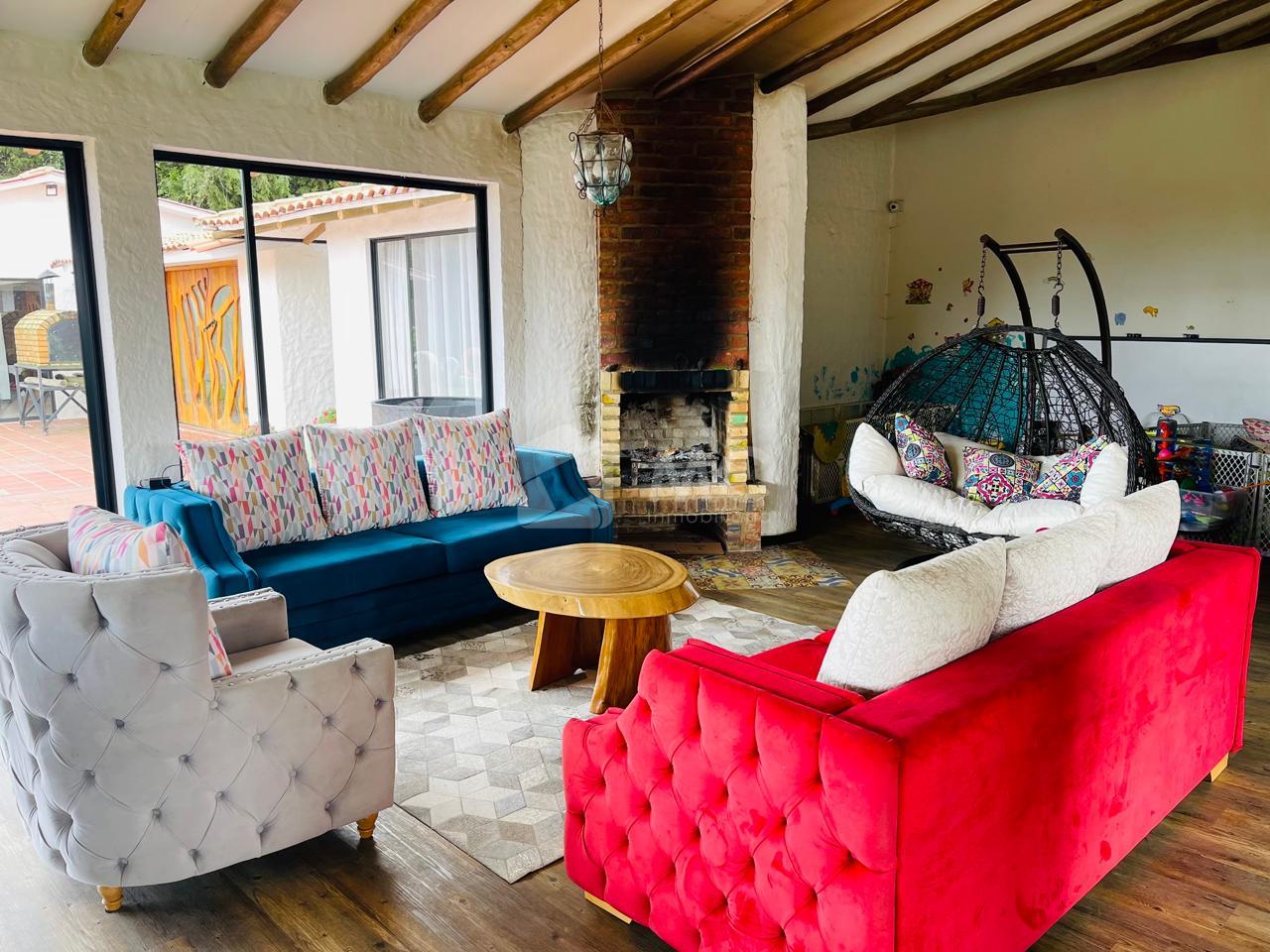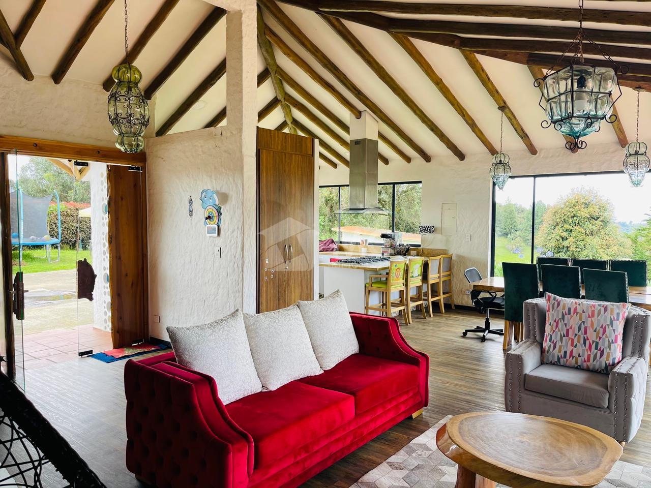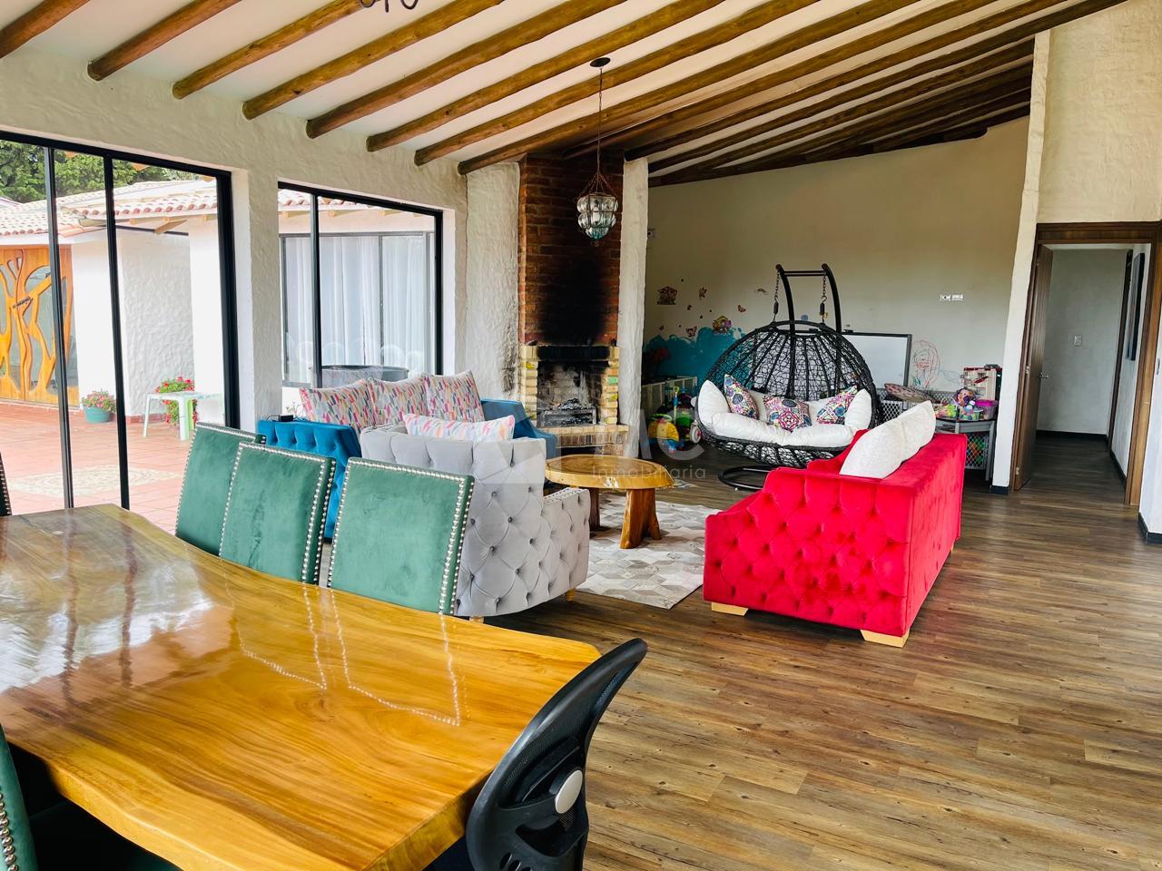 Casa principal. Tiene un área de 240 m2 en un solo nivel distribuida en 3 alcobas cada una con baño, cocina abierta, sala con chimenea, zona de lavado de 20 m2 y un baño auxiliar.